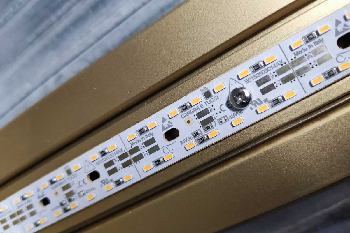 The LED boards assembled in Cangini & Tucci lamps are entirely developed in Italy, from design to implementation with solutions specifically designed to have the best performance in brightness and reliability (by a company with 30 years of experience in electronics and a strong specialization in lighting).
